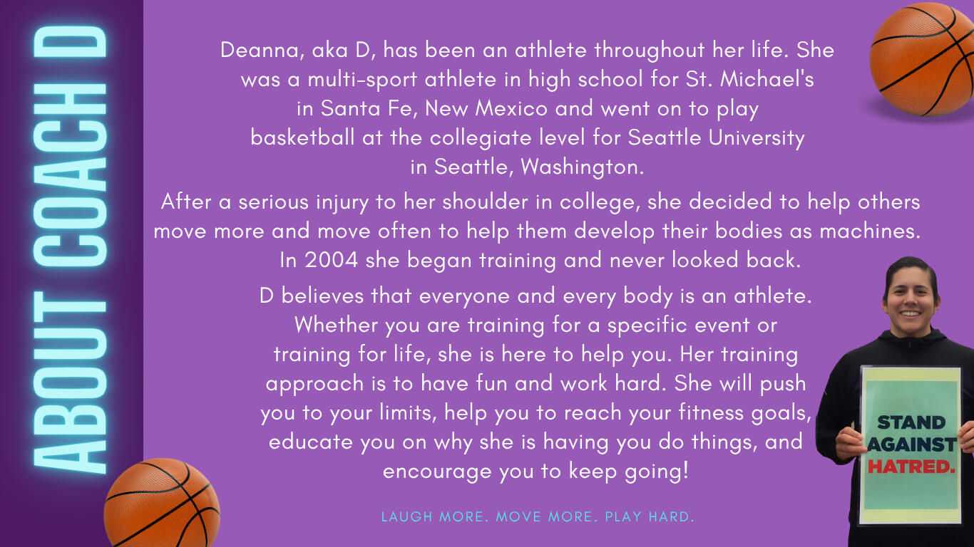 Coach D's coaching technique is designed for people seeking an in-depth program carefully tailored to their individual needs and personal goals.Your sessions are crafted to challenge you, inform and educate you, inspire meaningful change, and push you to accomplish things you never thought possible.She specializes in motivating clients to overcome obstacles, gently pushing them to expand their limits, and helping them move their bodies in the natural, functional ways they were meant to move. Her primary aim is to enhance the everyday lives of her clients by tapping into both their inner resilience and outer strength, supporting their ambitions, and making sure there’s room for play and enjoyment along the journey.If this sounds like the right fit for you, sign up today for your Virtual Blueprint For Success.