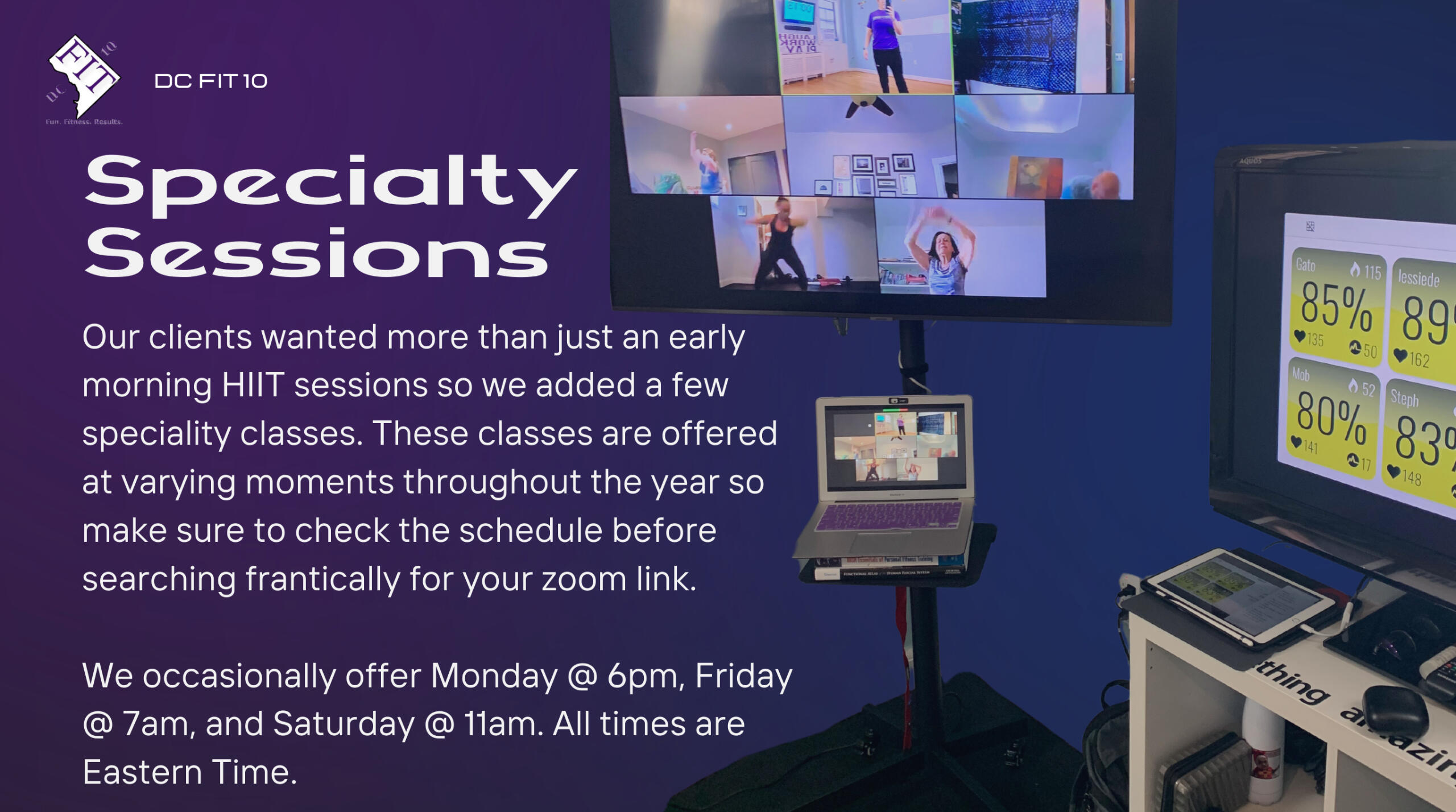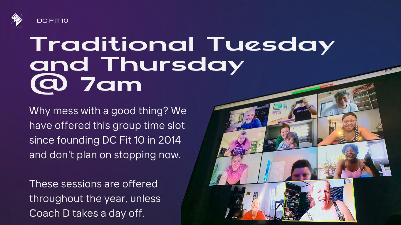 Virtual Team Training has evolved over the last few years. We pride ourselves on the community that we have created amongst our clients, even virtually. If you are looking for a supportive team environment, log on and train with us. The bonus of virtual training is that we mute all of our participants so you can sing as loud as you like to all the throwback music we play during our sessions.We design each session to give you a great workout, while offering regressions and progressions as needed to ensure you always have a great training session. If you are getting back into training or have been training for awhile, we got you. We will help you to get moving and stay moving.If you are new to DC Fit 10 and interested in joining one of our sessions please sign up for one of our Meet & Greet sessions to ensure we are the right fit for you. We highly recommend that you are injury free and/or have worked 1:1 with DC Fit 10 before attending our Team Training sessions. We look forward to meeting you!